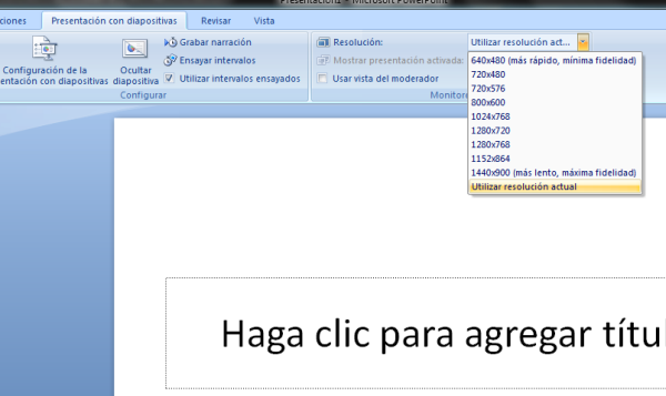 Para eso nos dirigimos a la pestaña Presentación con diapositivas hacemos click y veremos debajo y en el extremo derecho otro menu desplegable llamado sencillamente Resolución haciendo click aquí veremos una lista con las resoluciones disponibles, las más bajas ofrecen menos detalles pero con ellas lograremos presentaciones más rápidas, y las resoluciones más altas tiene buen detalle de imágenes pero son mas lentas, debemos elegir aquella que produzca mejores resultados en la proyección.